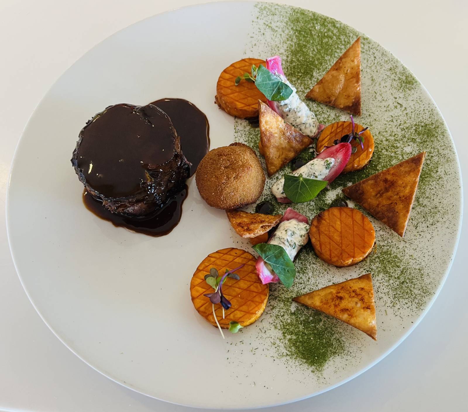 Épaule d'agneau confite, palets de patate douce cripsy et moelleuse, condiment à la grecques