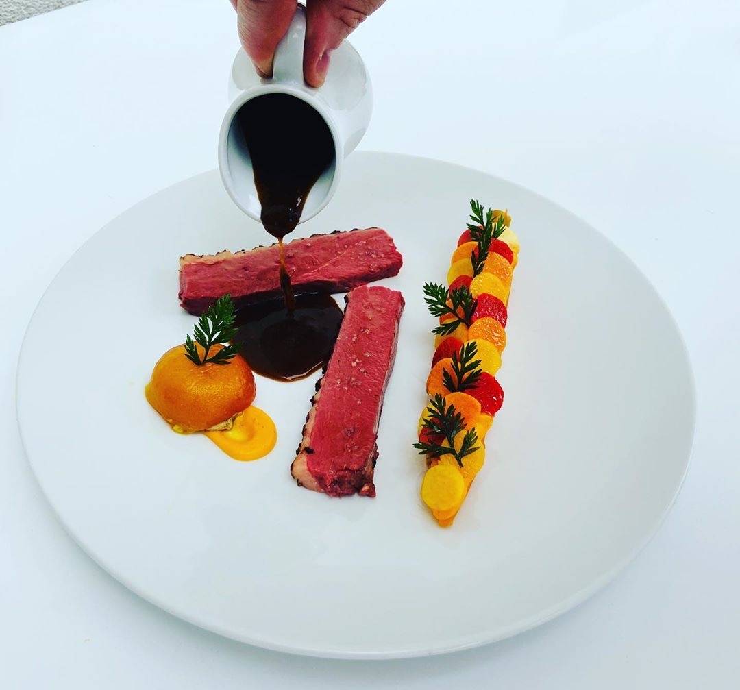 Dégustez notre magret de canard Maison Rougié laqué au vinaigre de gingembre, croustillant de cuisses confites, carottes fanes confites, en mousseline et croquante