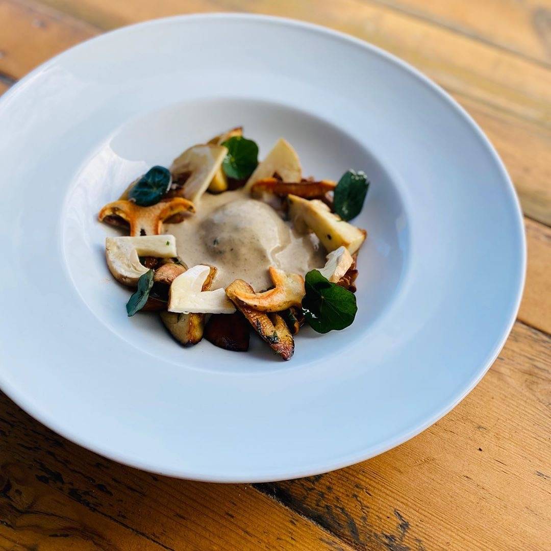 Raviolis aux champignons des bois, crème de cèpes, girolles, cèpes et lactaire en persillade